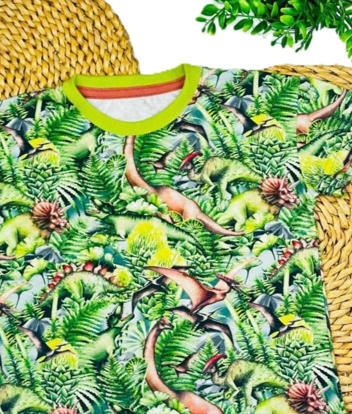 Bluzka dla chłopczyka na krótki rękaw Mrofi Dinozaury to doskonały wybór na letnie dni – lekka, przewiewna i wykonana z wysokiej jakości bawełny. W całości pokryta kolorowym, dziecięcym wzorem w dinozaury i tropikalne liście, przypadnie do gustu każdemu małemu miłośnikowi prehistorycznego świata.