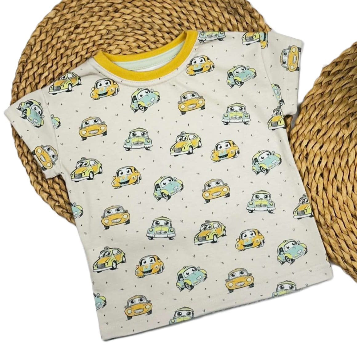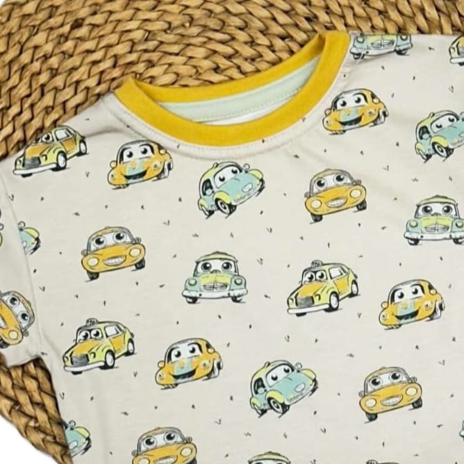 Bluzka na krótki rękaw Mrofi Garbusek to doskonały wybór na lato i codzienne aktywności Twojego malucha. Uroczy wzór z kolorowymi samochodzikami – żółtymi i niebieskimi – z pewnością przypadnie do gustu każdemu małemu miłośnikowi motoryzacji.