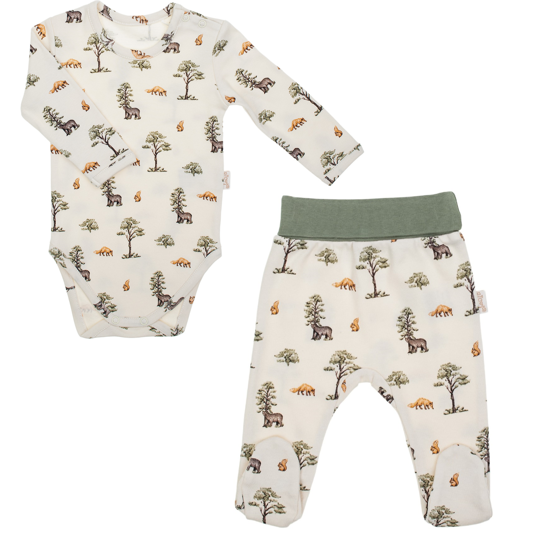 Wyjątkowy komplet dla niemowlaka chłopca Bamarnicol Leśne Zwierzątka to idealna propozycja od polskiej marki Nicol. Zestaw składa się z wygodnego body z długim rękawem oraz półśpiochów uszytych ze 100% bawełny najwyższej jakości. Całość zdobi uroczy, kremowy wzór w motywy lasu i zwierzątek – sarenki, liski i misie. Połączenie barw kremowej, khaki, pomarańczowej i brązowej tworzy piękną, naturalną kompozycję, idealną zarówno dla chłopców, jak i dziewczynek.