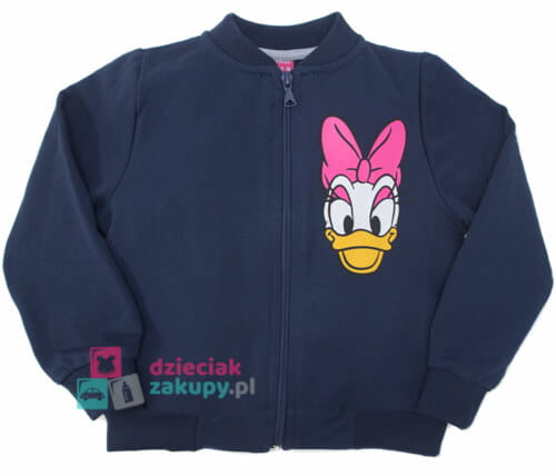Bluza dziewczęca z granatowym kolorze z małą aplikacją kaczki na przodzie i większą aplikacją na plecach. Bluza zapinana jest na wygodny zamek i wyposażona ściągacze na rękawach.