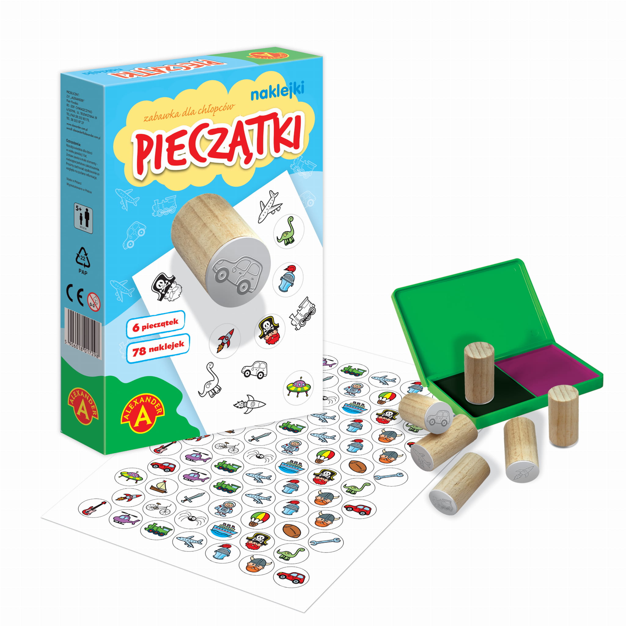 Zawartość pudełka: pieczątki - 6 szt. naklejki - 78 szt., poduszka na tusze , instrukcja