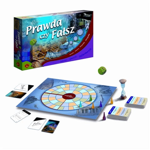 Zawartość pudełka: plansza, 206 kart stwierdzeń, 12 kart prawda/fałsz, 2 karty "kategoria", 6 pionków, kostka, klepsydra, instrukcja.