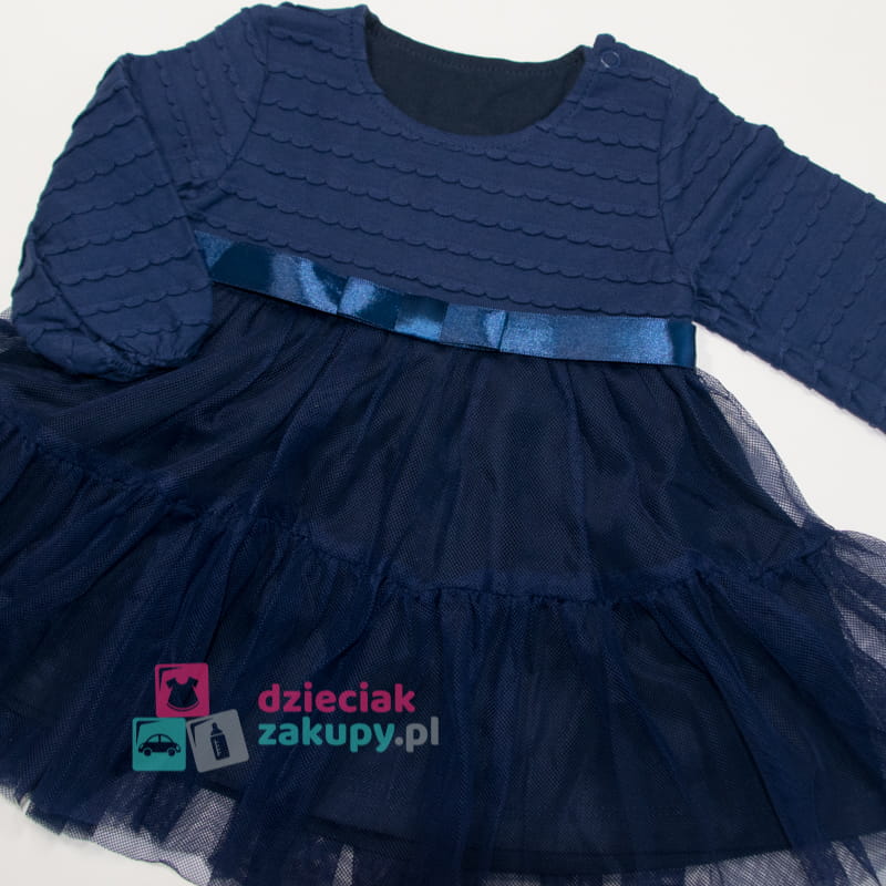 Granatowa sukienka niemowlęca z eleganckim tiulowym wykończeniem. Sukienka o luźnym kroju, odcinana na wysokości pasa. W pasie ozdobna tasiemka z kokardką. Bardzo ładnie się układa. Każda dziewczynka poczuje się w niej jak prawdziwa księżniczka.