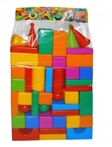 W opakowaniu: 43 szt. klocków dmuchanych (w różnej konfiguracji kolorów i kształtów).