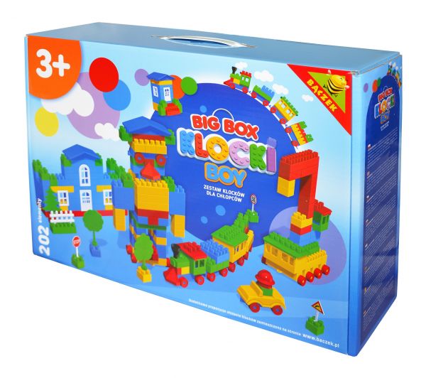 Zestaw klocków konstrukcyjnych składający się z 202 elementów zapakowany w kolorowe pudełko z rączką. Klocki wykonane są z wytrzymałego, bezpiecznego dla dziecka tworzywa. Zestaw, dzięki swojej bogatej kolorystyce, różnorodności kształtów oraz wielu dodatkom daje nam nieograniczone możliwości budowania dowolnych konstrukcji co stymuluje zmysły najmłodszych i pozwala rozwinąć wyobraźnię przestrzenną. Klocki o szerokości 28mm.