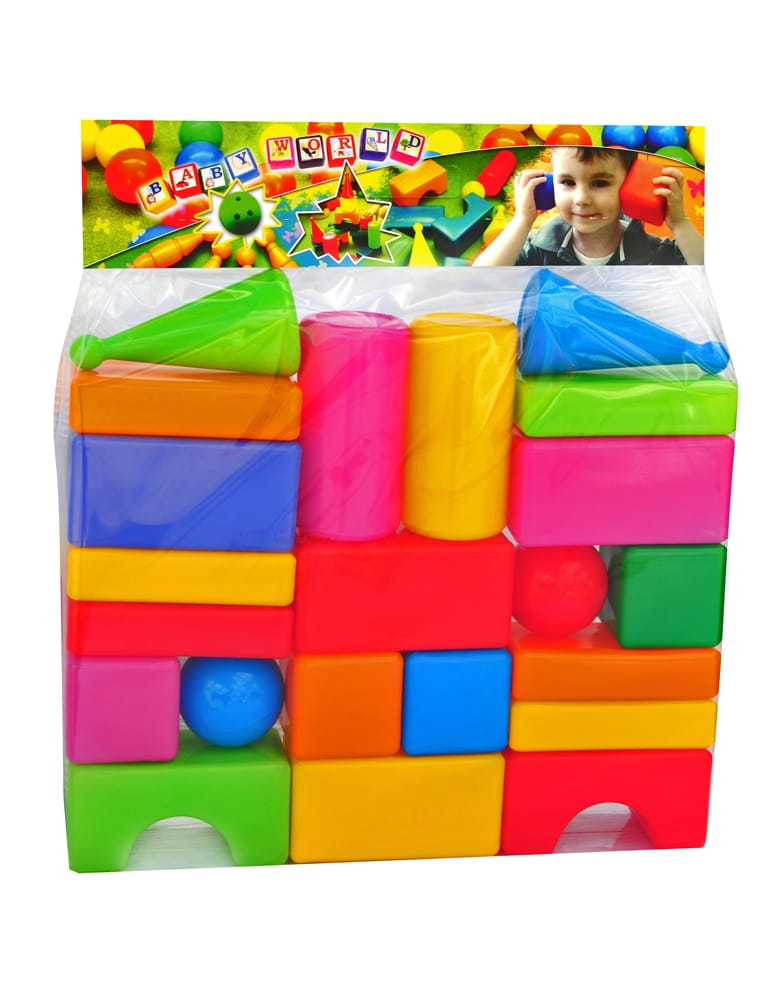 W opakowaniu: 22 szt. klocków dmuchanych (w różnej konfiguracji kolorów i kształtów).