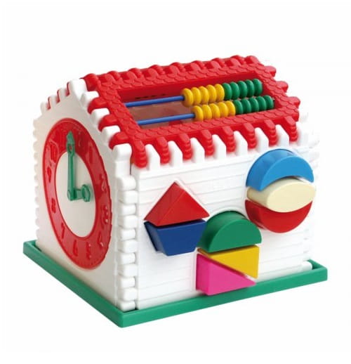Na ściance frontowej znajdują się otwory do wkładania różnokolorowych i różnokształtnych klocków. Ścianka tylna domku zawiera wgłębienia odpowiadające klockom w postaci cyferek i literek. Dach domku zawiera cztero-wrzecionowe liczydło.