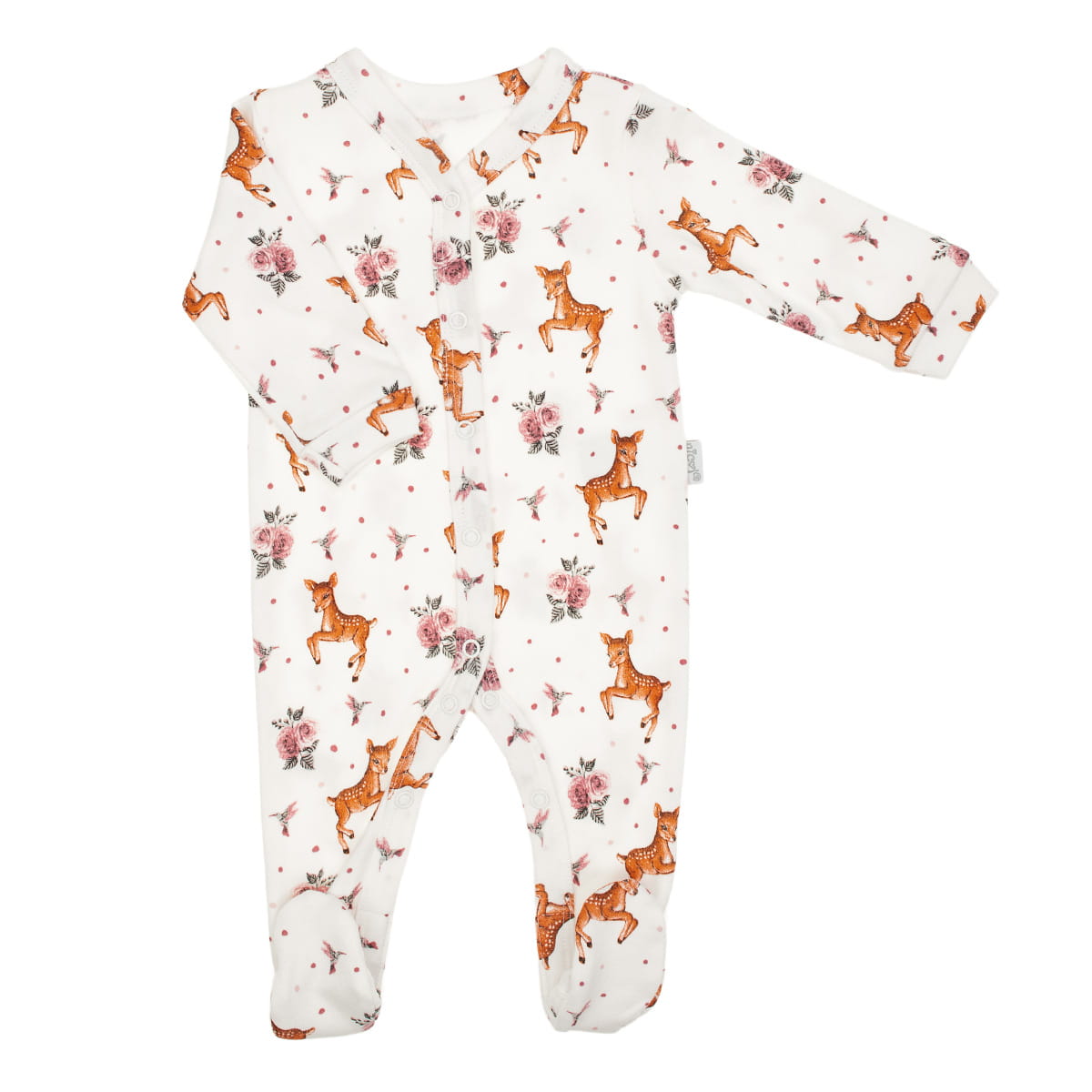 Ten model to prawdziwa perełka – biała tkanina ozdobiona motywem sarenek, ptaszków i różanych kwiatuszków przywodzi na myśl ciepło, naturę i delikatność. Połączenie klasycznej bieli z pastelowymi kolorami sprawia, że ubranko prezentuje się niezwykle subtelnie i dziewczęco. To idealny wybór dla małych miłośniczek zwierzątek.