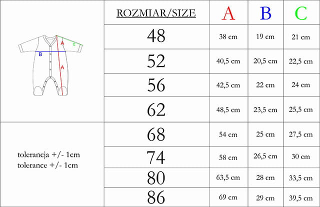 Aby idealnie dopasować pajacyk do dziecka, skorzystaj z tabeli rozmiarów umieszczonej w zdjęciach produktu. Dzięki niej z łatwością znajdziesz najlepszy rozmiar dla swojego maluszka.