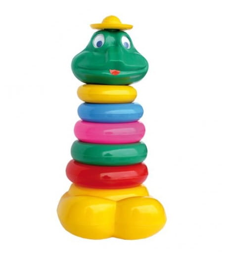 Piramidka do układania Żabka rechotka to zabawka edukacyjna dla malucha już od 18 miesiąca życia. Zadaniem malucha jest ułożenie krążków od największego do najmniejszego na patyk, całość wieży wieńczy główka żabki. Zabawka uczy rozpoznawania kształtów oraz ruchów oko-ręka.