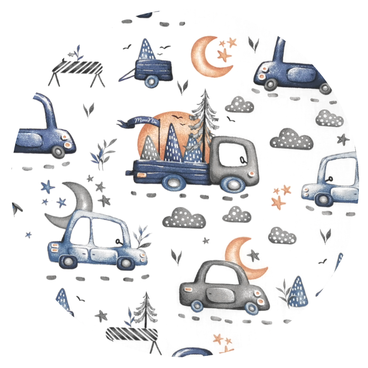 - Samochodziki niebieskie – Wzór przedstawiający urocze samochody na białym tle wprowadza do pokoiku dziecięcego atmosferę przygody i spokoju. To również doskonały pomysł na prezent dla noworodka.