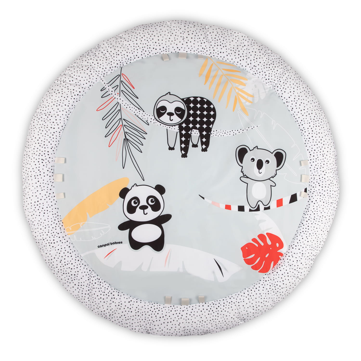 Mata edukacyjna z 6 zabawkami, które zachęcają dziecko do aktywności i wyciągania do nich rączek, pomaga rozwijać sprawność ruchową, wzmacnia mięśnie i ćwiczy zdolności manualne. Zabawki są zawieszone na pałąkach, które można łatwo zdemontować, aby wyprać matę lub zabrać ze sobą wszędzie tam, gdzie chcemy stworzyć dziecięcą przestrzeń, zapewniając bezpieczny i czysty kawałek podłogi. Zabawki można odpinać i podać do zabawy: 2 grzechoczące buzie zwierzątek, 2 szeleszczące listki z lusterkiem otoczonym kolorowymi metkami i grzechotką oraz z gryzakiem, który przyniesie ulgę podczas ząbkowania, duże odpinane lusterko, które można przypiąć w dowolnym miejscu i gdy Maluch podrośnie będzie zachęcało do leżenia na brzuszku oraz panda z piszczkiem i łapkami na rzepy, dzięki którym można połączyć je ze sobą i objąć nimi pałąk maty lub szczebelek dziecięcego łóżeczka.