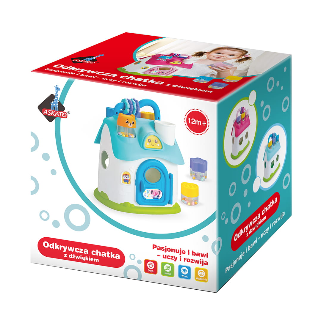 Nad drzwiczkami znajduje się okienko ze słoneczkiem, które świeci. Zabawki- klocki do wrzucania mogą pełnić funkcje grzechotek. Drzwiczki zamykane są na kluczyk.