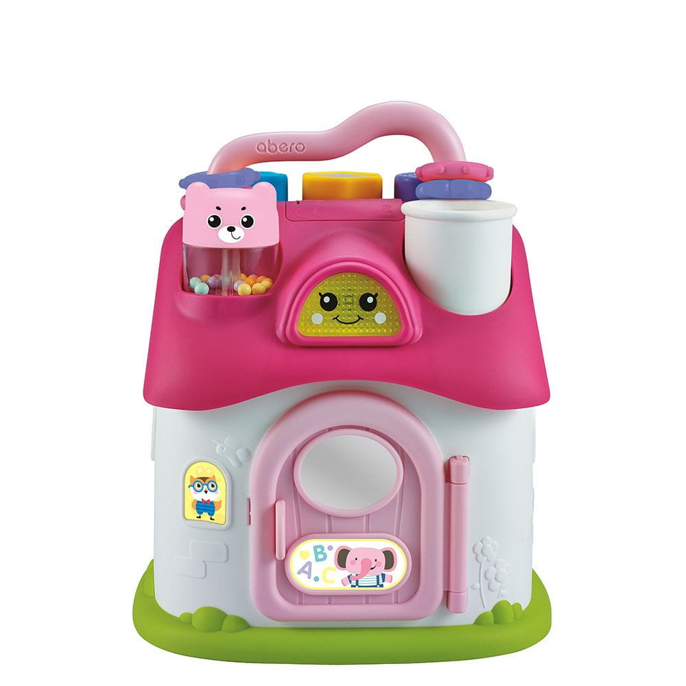 Zabawka sorter domek dla dziecka w kolorze białym z różowym daszkiem i drzwiczkami przeznaczona jest dla maluchów powyżej 12 miesiąca życia. Domek o wymiarach ok. 20x18x16.5 cm ma otwory o różnych kształtach do których maluch może wrzucać kolorowe grzechotki. Dziecko rozwija swoje umiejętności poznawcze, poznaje kształty i ćwiczy ruchy ręka- oko.
