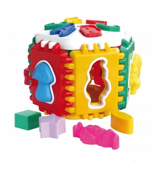 Zabawka przestrzenna wielokątna, zbudowana ze ścianek puzzli, które tworzą bryłę. Zamkniętą z dołu i góry płytkami – sortownikami, do różnokolorowych i różnokształtnych klocków. W pokrywie do klocków w postaci literek i cyferek. Boki wielokąta – ścianki puzzle, zawierają otwory wykończone ramkami. Do tych otworów dopasowuje się różnokolorowe klocki o tematyce leśnej, np.: choinka, wiewiórka, krasnal. Zabawka dla przedszkolaka rozwija orientację przestrzenną, uczy logicznego myślenia. Koordynuje rozwój psycho-ruchowy.