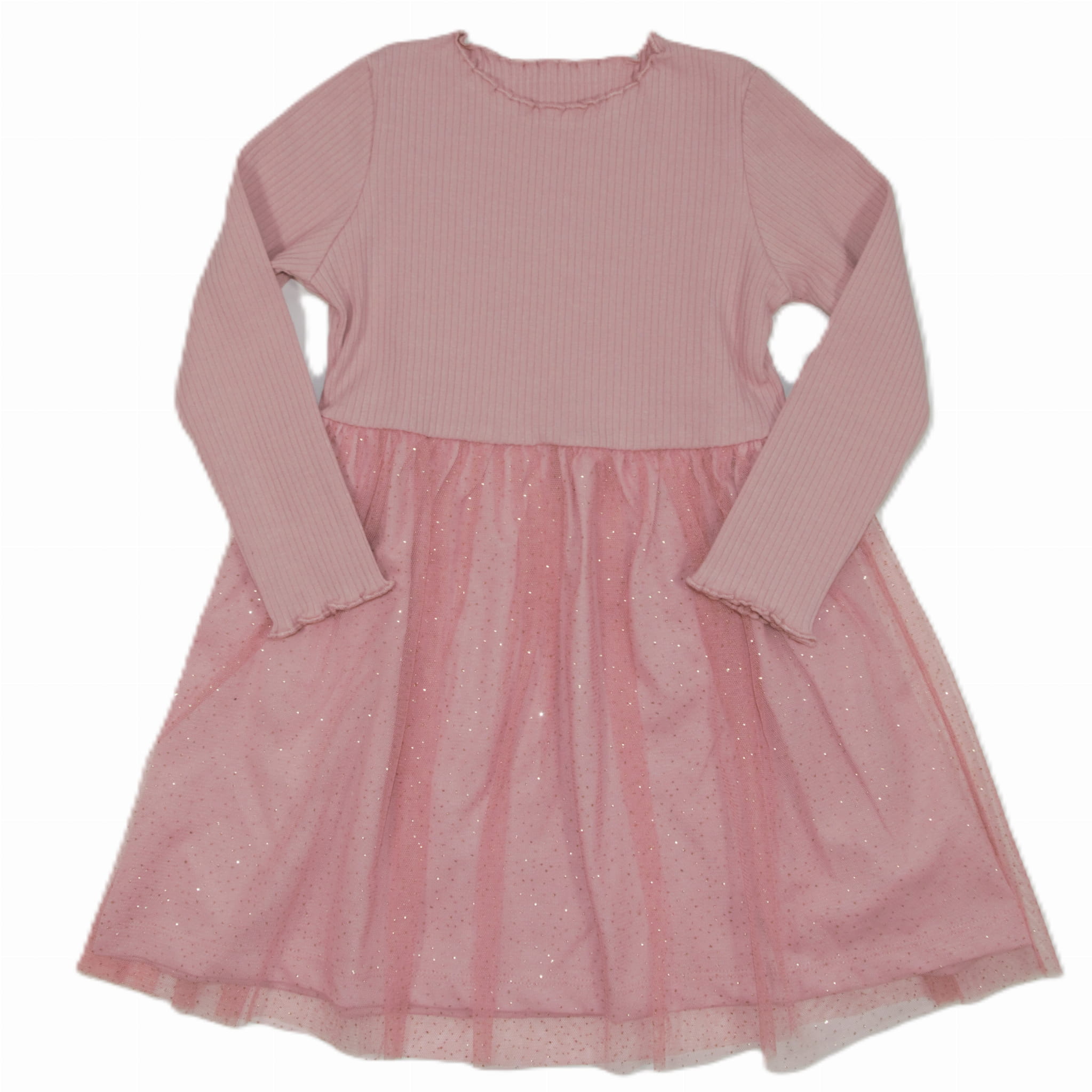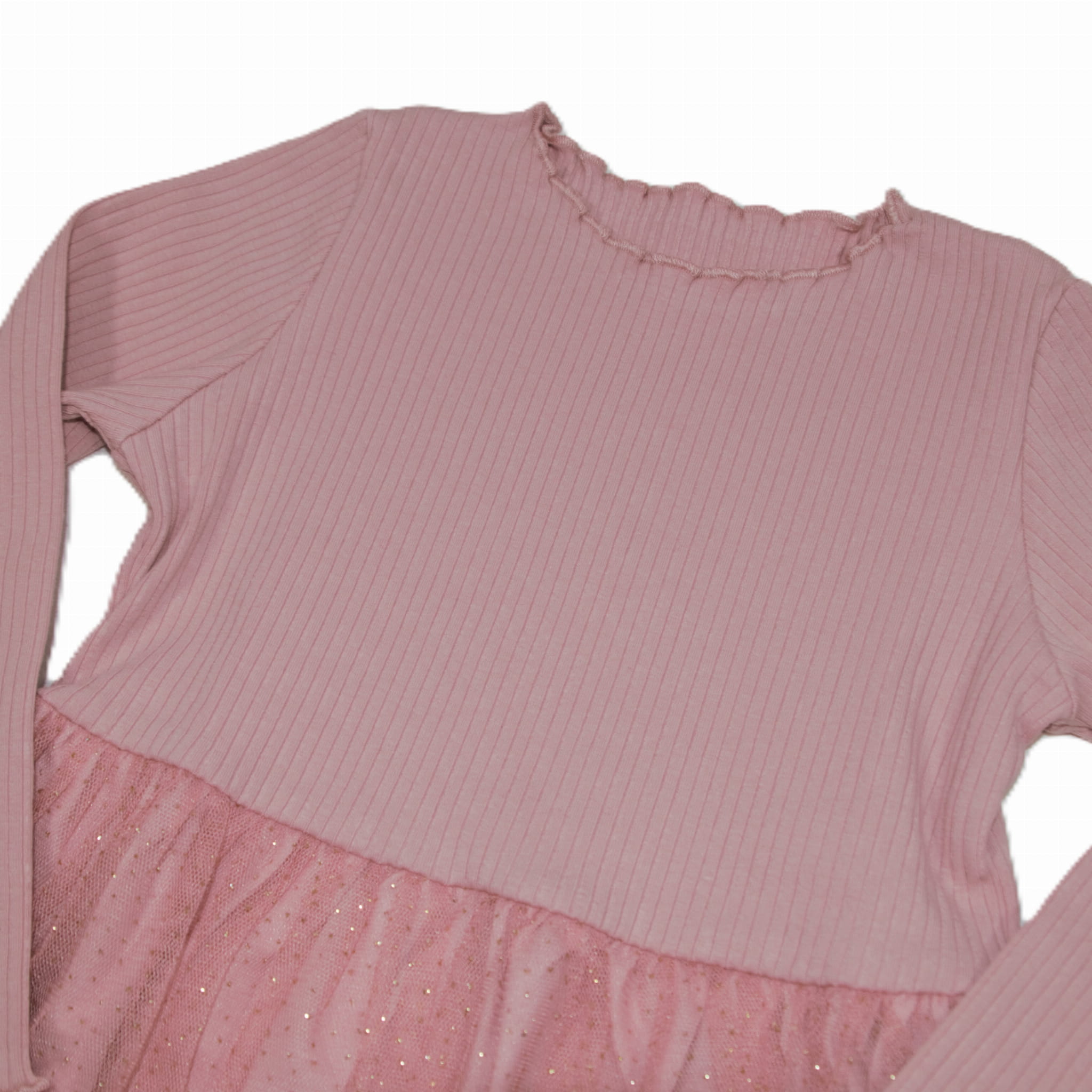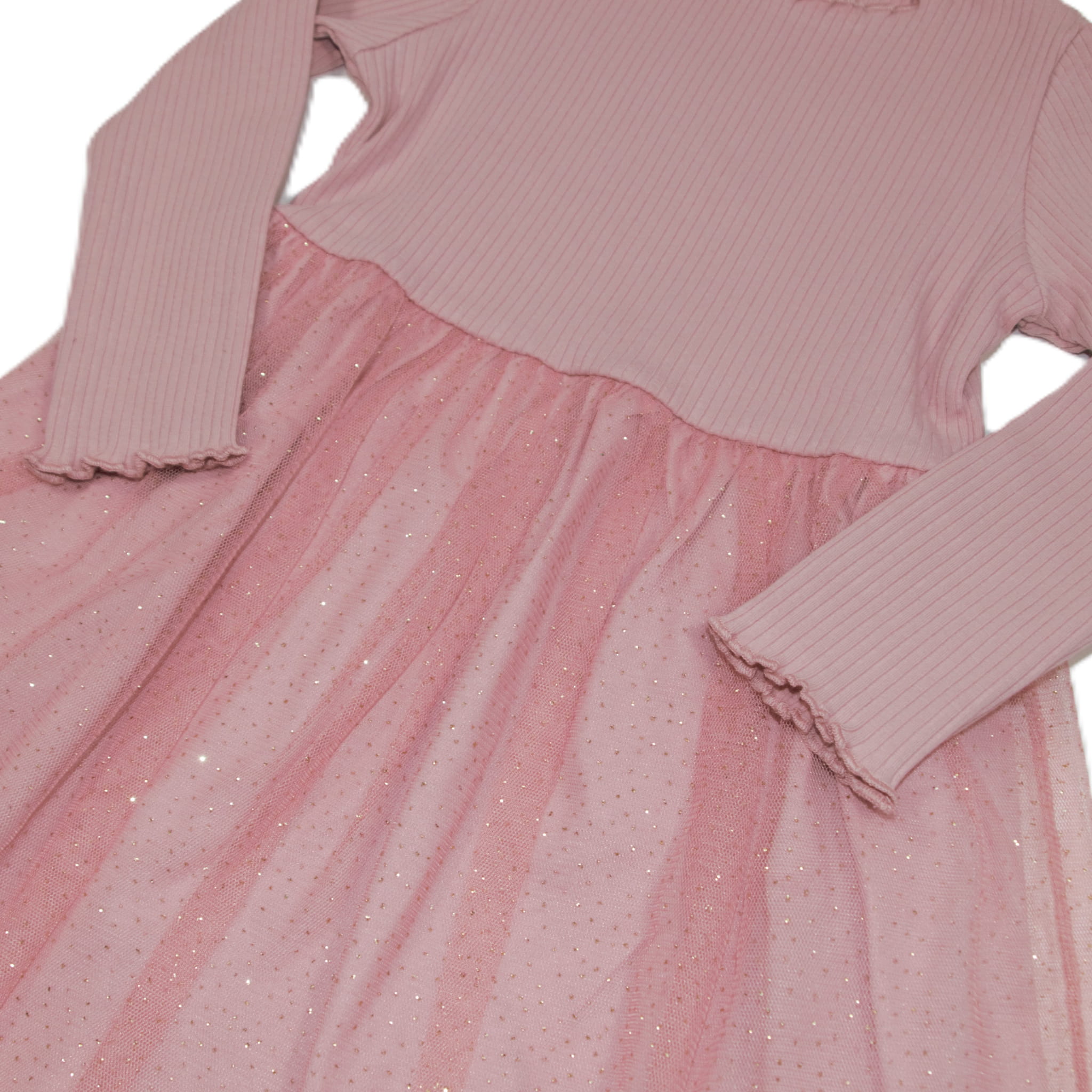 - Materiał: góra sukienki wykonana z przyjemnego w dotyku, prążkowanego materiału. Dół sukienki wykonany z brokatowego tiulu.