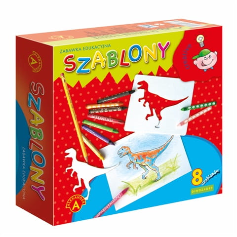 to zabawka, która składa się z 8 szablonów, które przedstawiają 8 różnych dinozaurów. Co ważne szablony przedstawione są w dwóch formach: wewnętrznych szablonach i zewnętrznych (w pozytywie i negatywie). Dzięki nim dziecko może w łatwy sposób narysować wybrane zwierzątko, co jest zachętą i pretekstem do narysowania całego obrazka. Dodatkowo w zestawie jest 12 kredek, ołówek oraz bloczek. Całość tworzy zestaw do którego już nic nie musisz dokupywać.
