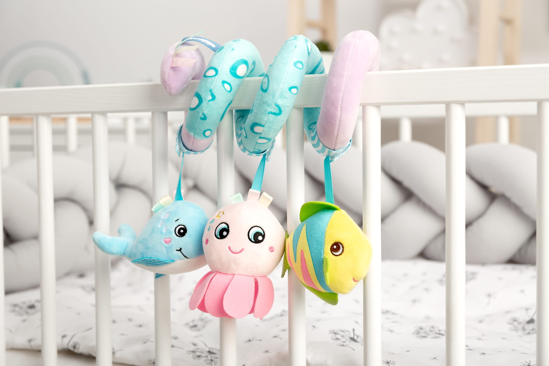 Zabawka w formie sprężynki pozwala na zamocowanie jej na łóżeczku, pałąku wózka lub fotelika. Dużym plusem zabawki jest jej łatwość montażu.