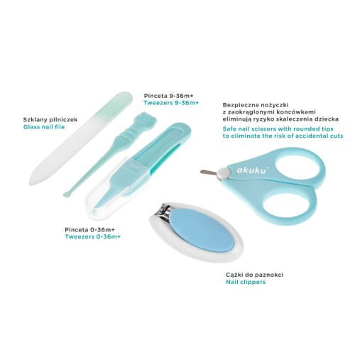 Zestaw do pielęgnacji niemowląt Apple Akuku to komplet składający się z: nożyczek, cążków z ogranicznikiem, pilniczka oraz pincety (2 szt.). Zestaw jest niezwykle przydatny i praktyczny, zapakowany w etui w kształcie jabłka. Dzięki etui wszystkie niezbędne produkty będą w jednym miejscu - idealny w domu, jak i w podróży.