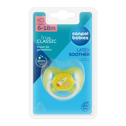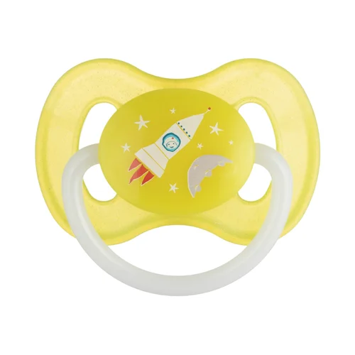 Smoczek Canpol Babies KOSMICZNY w żółtym kolorze łączy bezpieczeństwo, wygodę i atrakcyjny kosmiczny motyw z praktycznym świecącym uchwytem – idealny dla starszych maluchów w wieku 6–18 miesięcy.